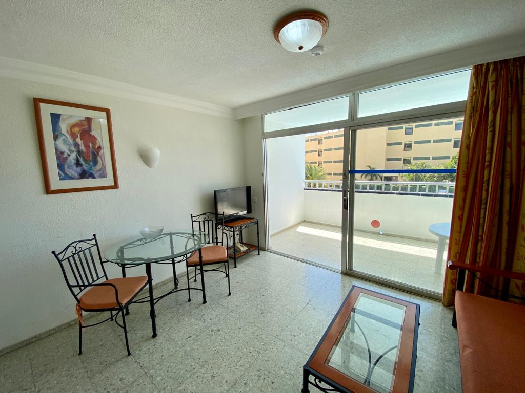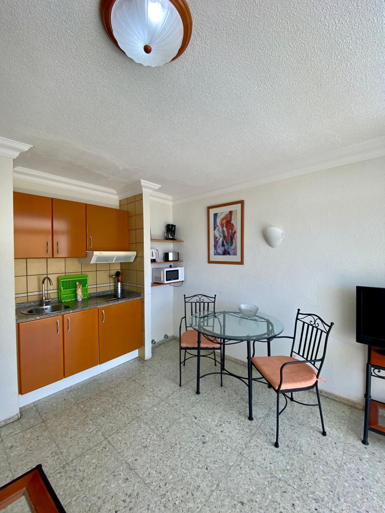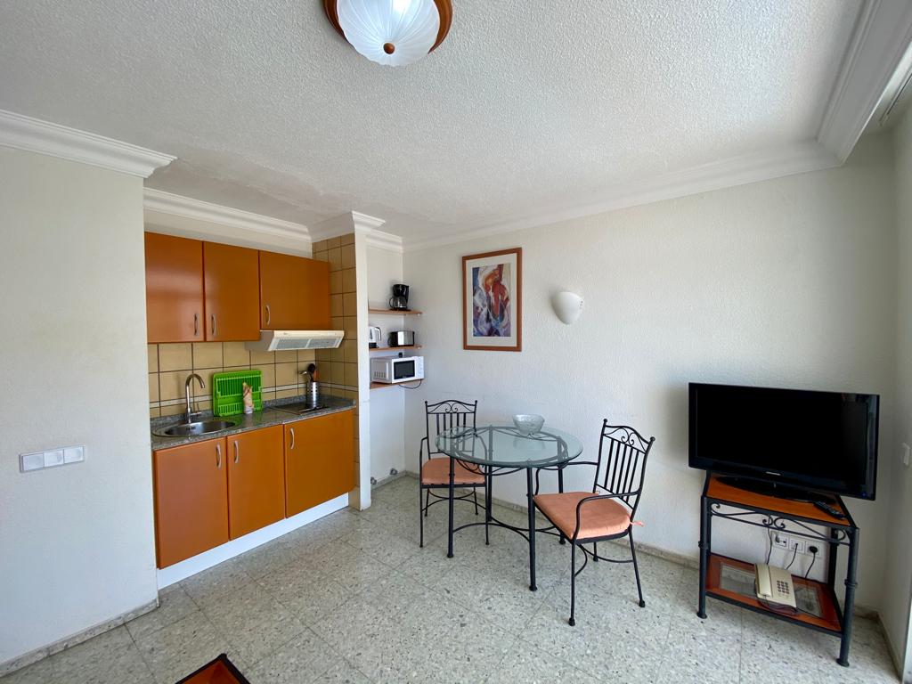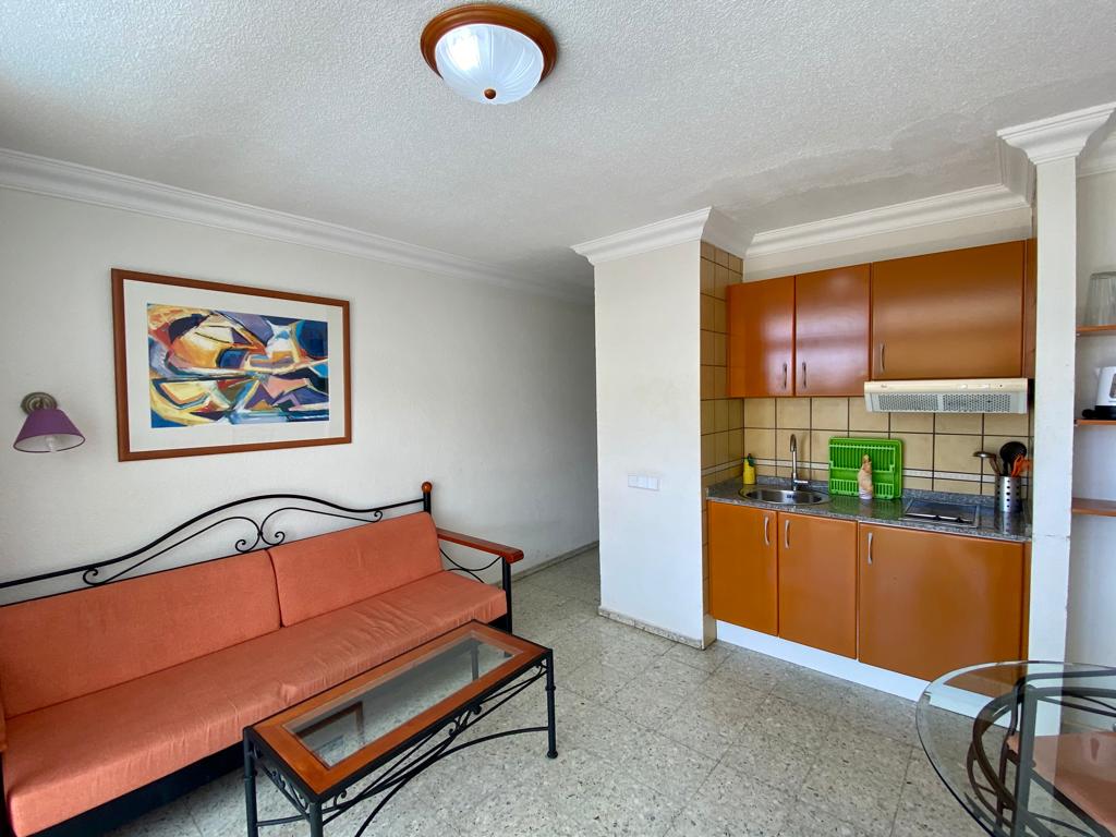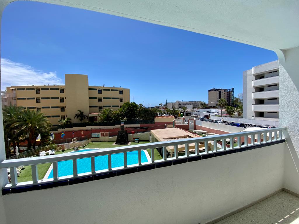 Apartment mit entferntem Meerblick, z.Zt. in touristischer Vermietung mit sehr guter Rendite, strandnah in Playa del Inglés: Geräumiger Wohn-Essbereich mit Einbauküche, 1 Schlafzimmer und ein Badezimmer mit Dusche. In der Anlage befindet sich ein beheizter Gemeinschaftspool und Gemeinschaftsparkplätze.