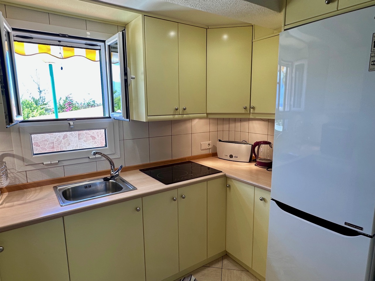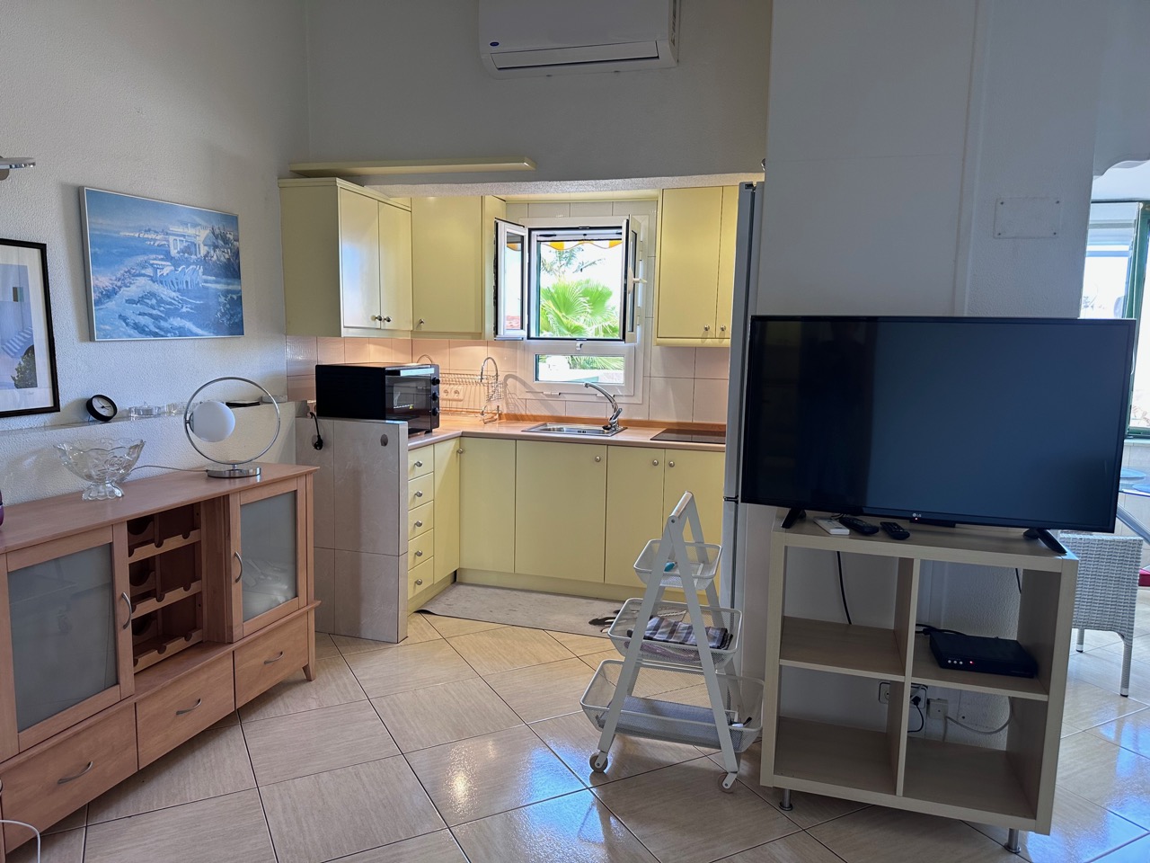 Besteht aus einem Wohnzimmer mit Küche, einem Schlafzimmer, einem Badezimmer mit Dusche, einer geschlossenen Terrasse, die derzeit als Küchen-Ess-Wohnbereich genutzt wird, einer grossen Terrasse und einer kleineren Terrasse mit Aussenschrank, welcher Waschmaschine und Wasserboiler beinhaltet.